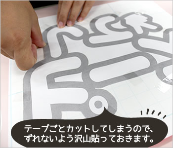 ピンクのシールの裏側に、カットした型紙を置き、セロテープでずれないように貼り付けます。
