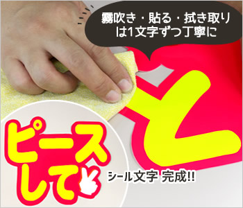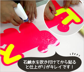 1文字ずつ霧吹きをして文字を貼り、乾いた布で空気が入らないように水分を拭き取りながらしっかりと貼りつけます。