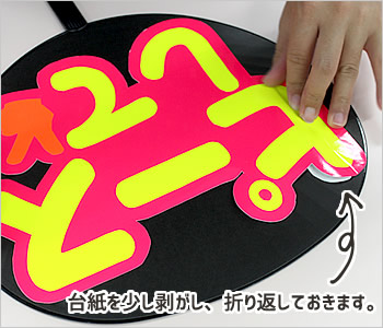 うちわにシールを合わせ、位置を決めたら、台紙を少しだけ剥がして折り返しておいた部分を貼り付けます。