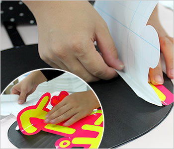 バック部分のピンクのシールに、イエロー文字を貼っていきます。石鹸水を使うと修正しやすく空気も抜けやすいです。