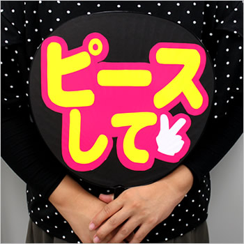 今回は、推し活うちわの「ピースして」をイエロー文字と白ピースマーク、バックをピンクにした、2重 文字 片面うちわを作成してみました!