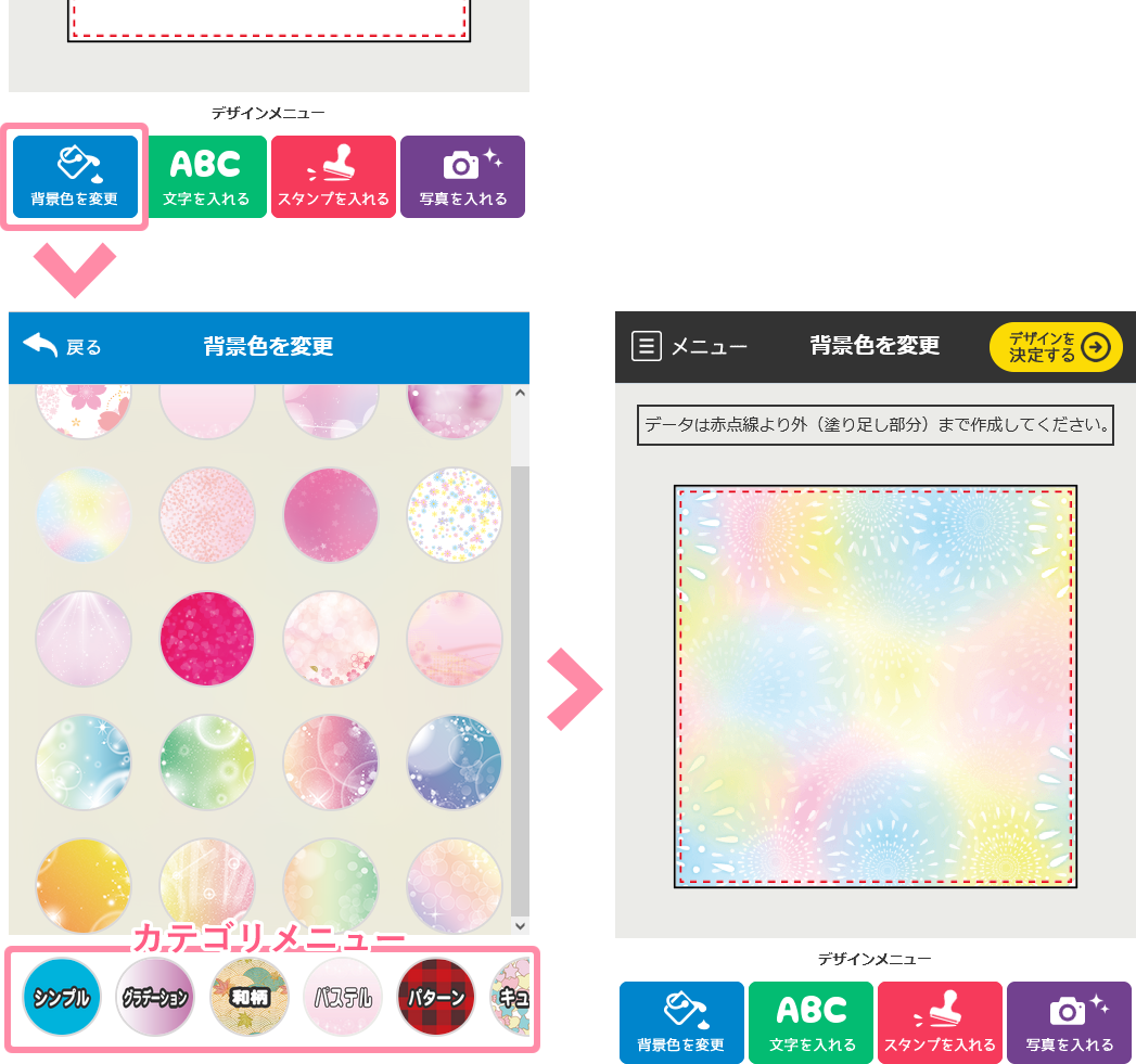 - 背景の色や柄を何も選択しない場合の背景色は白または素材の地の色になりますのでご注意ください。(うちわの背景のみ初期カラーは黒)