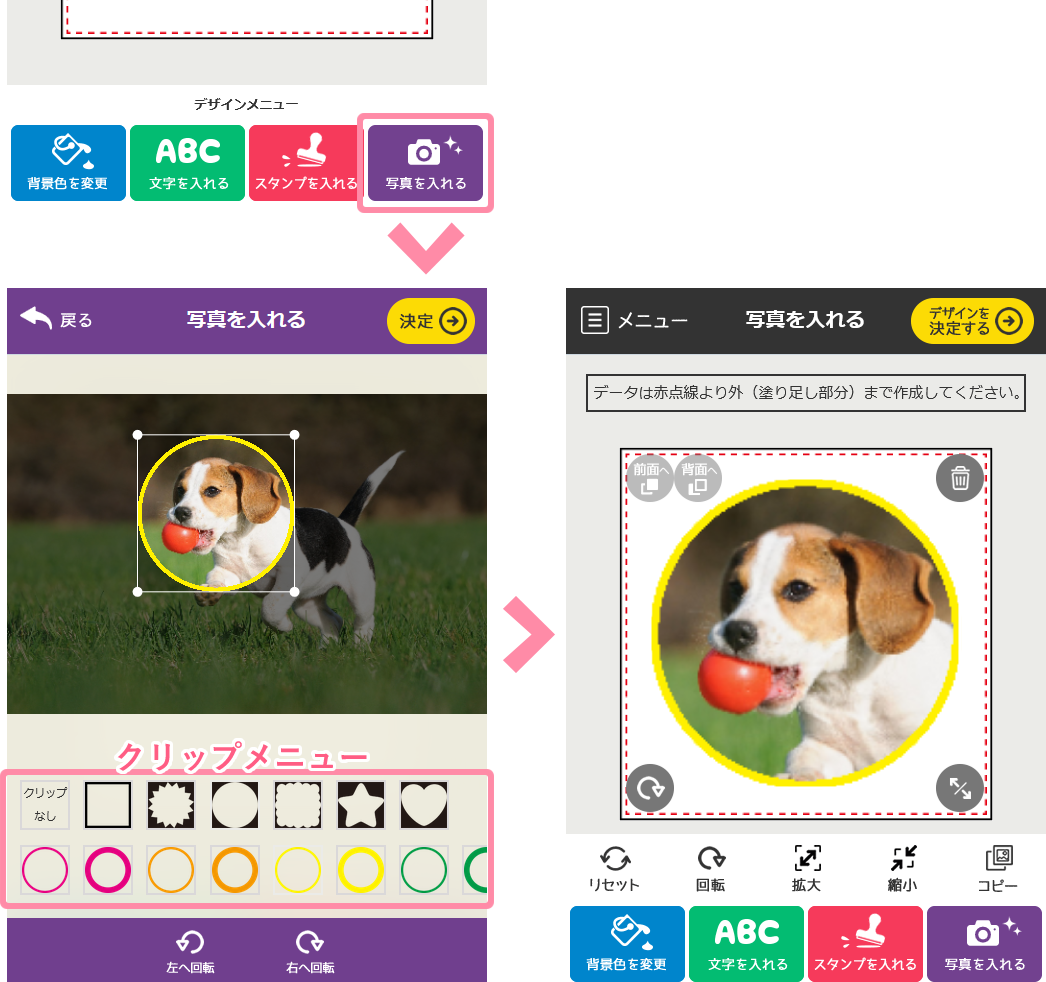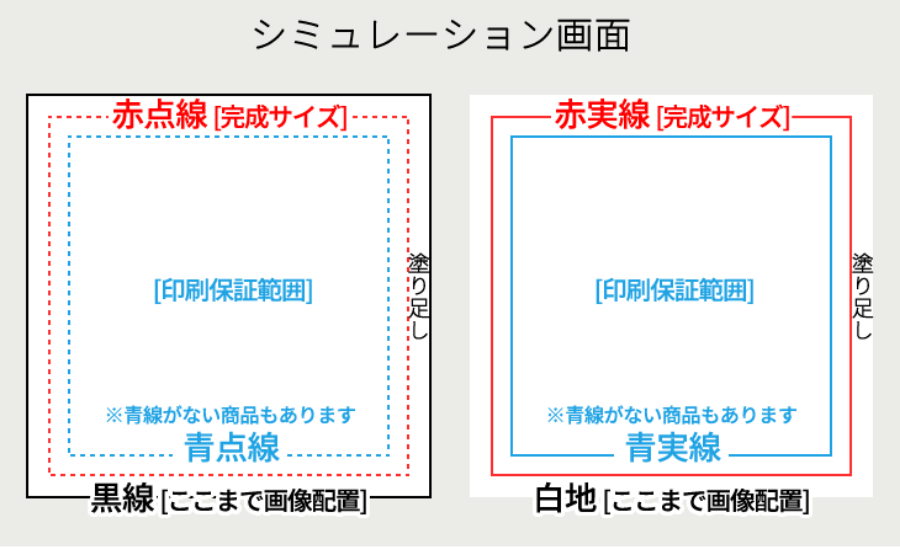 ※透明素材のものは、何も選択しない部分は白インクだけが印刷され、透明にはなりません。 - 文字やスタンプをできあがり線ぎりぎりにレイアウトする際、画面上で少しでもはみ出していれば、その部分は切れた状態でプリントされてしまいます。できあがり線ぎりぎりで作成する場合は、すべてが枠の中に入っているかどうかしっかりと確認してください。(意図的にはみ出している場合は除く)