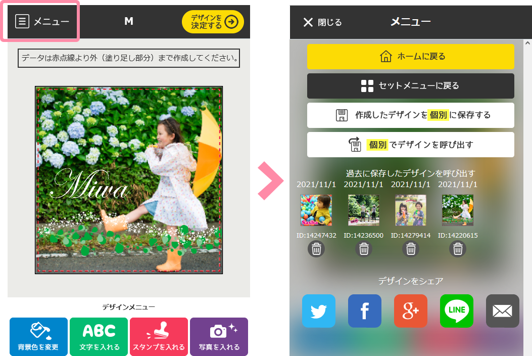 - デザイン保存時のみ、SNSのシェアボタンが表示されます。作成したデザインのIDをSNSで共有することができます。